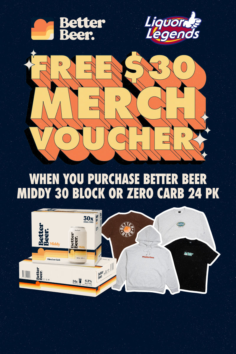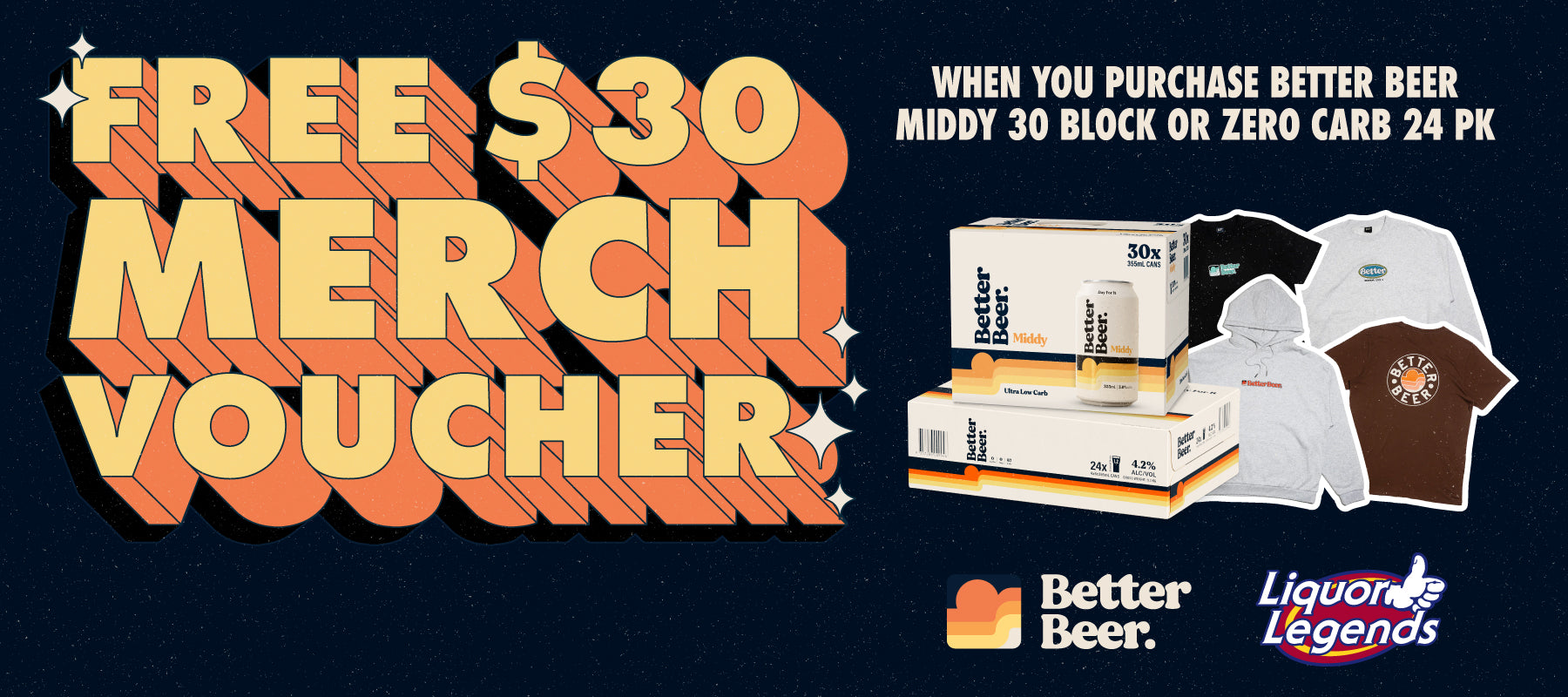 AU residents 18+ only. Promo period: 12.01am (AEDT) 21/10/2025 to 11.59pm (AEDT) 31/12/25. Buy a case of Better Beer Middy (30pk cans) or a case of Better Beer Zero Carb (24 pk) from participating Liquor Legends stores (incl. online at those stores), during venue promo period scan QR code in store or visit betterbeer.com.au/pages/free-30-merch-voucher-liquor-legends & fill in claim form with valid proof of purchase to get Gift. Keep purchase receipt/s. Merch vouchers must be used on or before 31/12/2026, can't be used for delivery costs & are single use only. See betterbeer.com.au for full conditions incl. privacy statement. Promoter: Better Beer Company Pty Ltd (ABN 68 652 336 822).